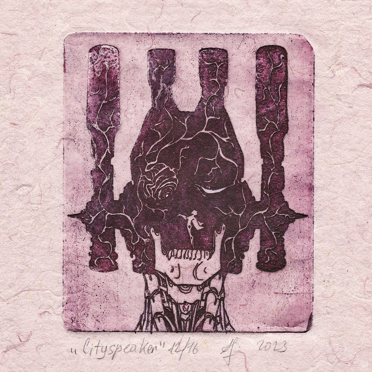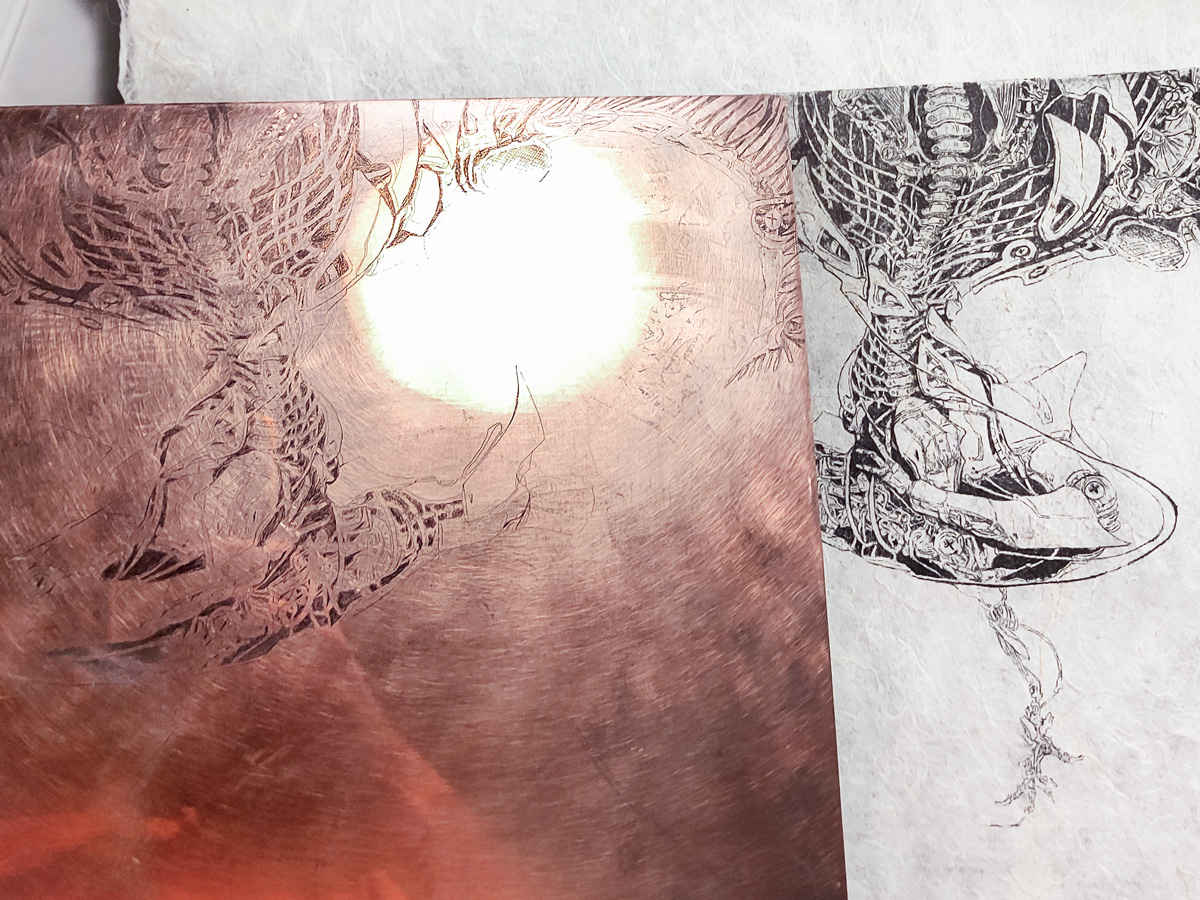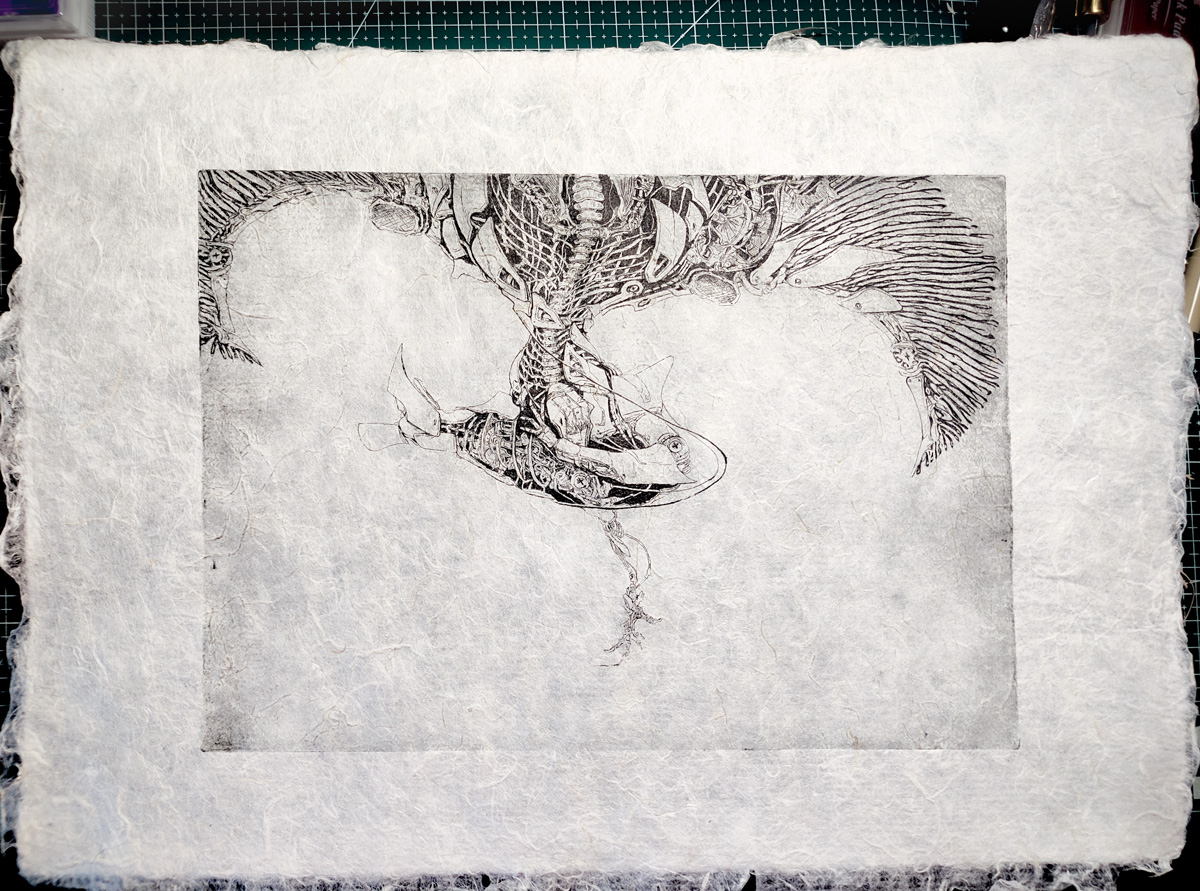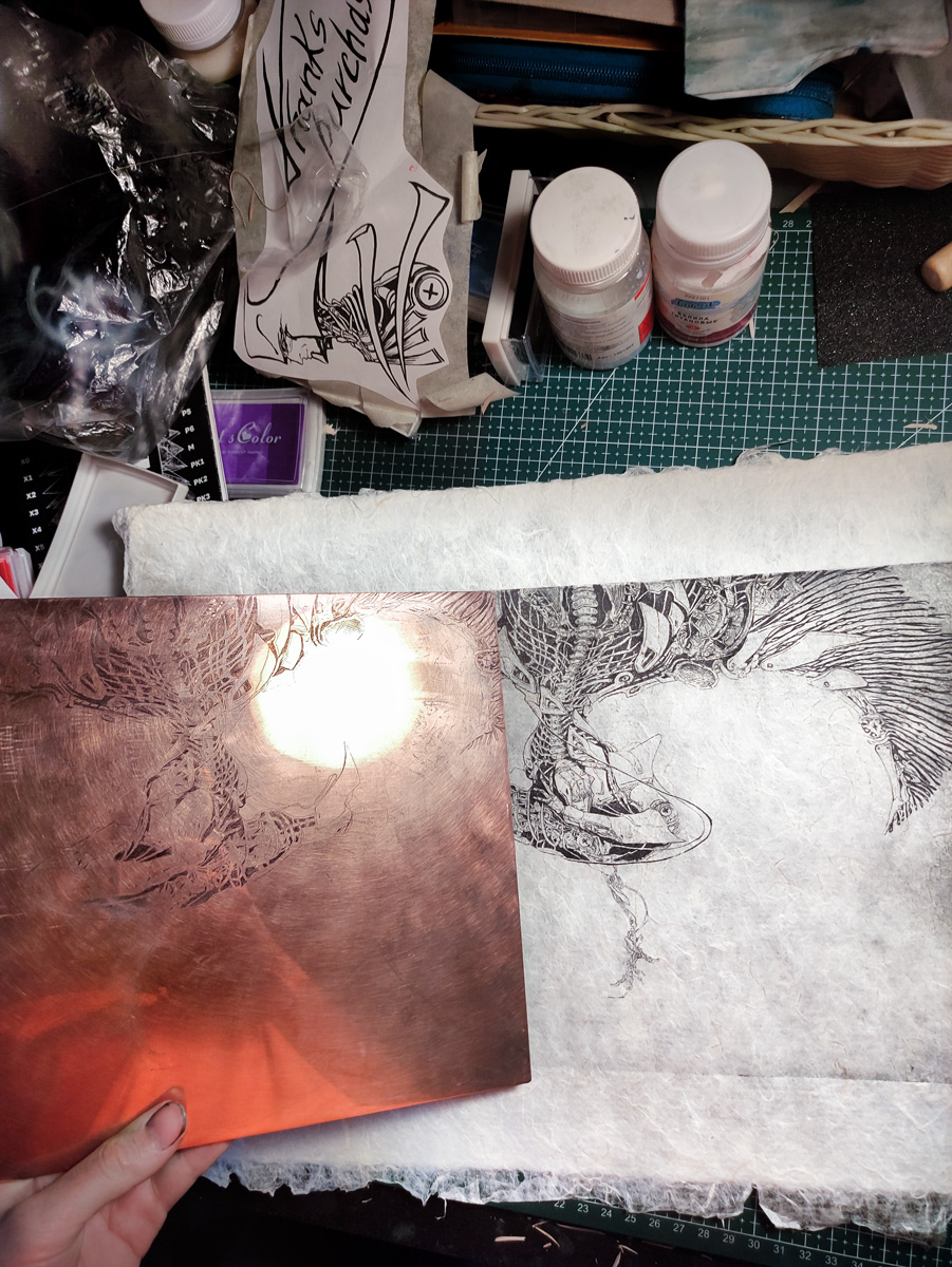 Художник Alex P печатает в технике офорта. Для печати она использовала пеньковую бумагу Лектон ручного отлива.